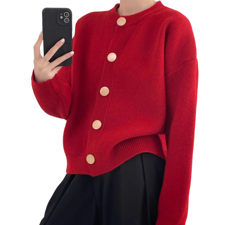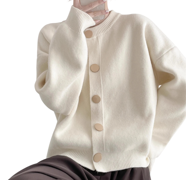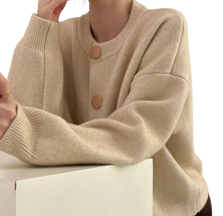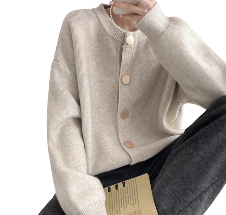 Damekardigan i bomuld og akryl med lange ærmer og knaplukning Enfarvet sweater i universel størrelse Elegant damemode