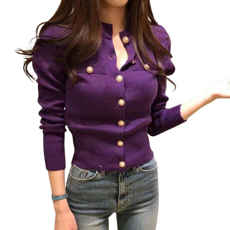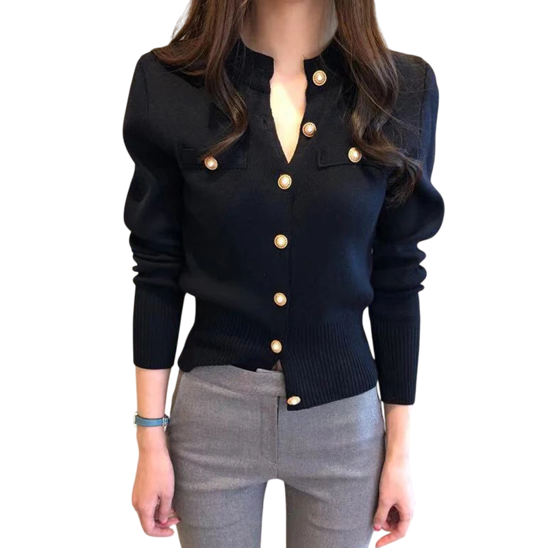 Damekardigan i bomuld og uld med lommer på brystet Enfarvet striktrøje med knapper og lange ærmer Universel størrelse