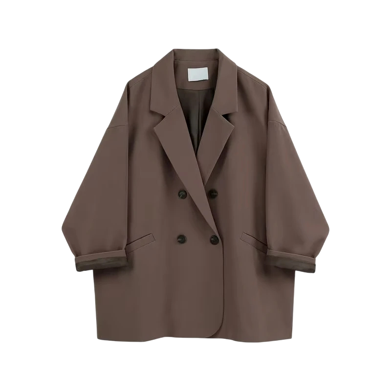 Elegant damesako med krave, lommer og knaplukning. Fremstillet af kvalitetspolyester, velegnet til arbejde og sociale begivenheder. Fuld beskrivelse