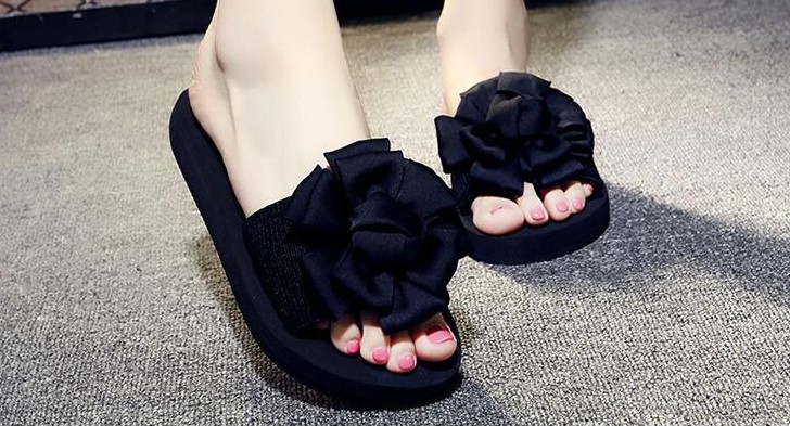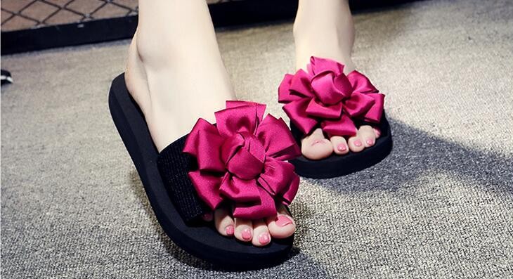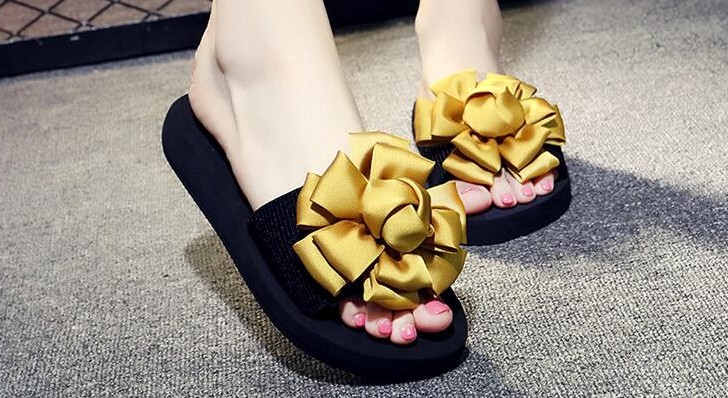 Hjemmeskoene er behagelige og dekoreret med en blomsterformet sløjfe.
