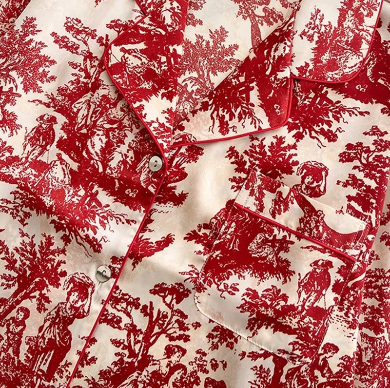 Denne damepyjamas i hvid med røde mønstre er det perfekte valg for kvinder, der elsker komfort, stil og blid elegance. Fremstillet af en kvalitetsblanding af polyester og rayon, tilbyder pyjamasen blødhed, åndbarhed og en glat overflade, der er behagelig at røre ved. Materialet er let, køligt og alligevel tilstrækkeligt varmt til at bære i de koldere nætter. De røde mønstre på den hvide baggrund fremstår romantiske og friske, hvilket giver sættet et moderne og feminint udseende.