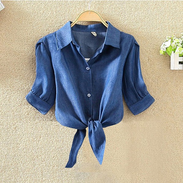 Den er dekoreret med en simpel knude forneden, hvilket gør skjorten kortere.
