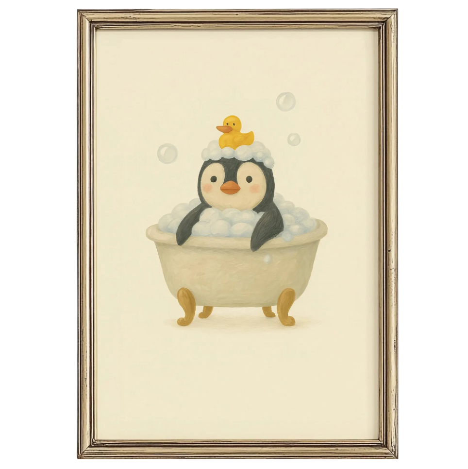 Plakat med pingvin i skummende bad bringer et legende motiv til badeværelset. Lærred uden ramme i mellem størrelse velegnet til væggen. Fuld beskrivelse