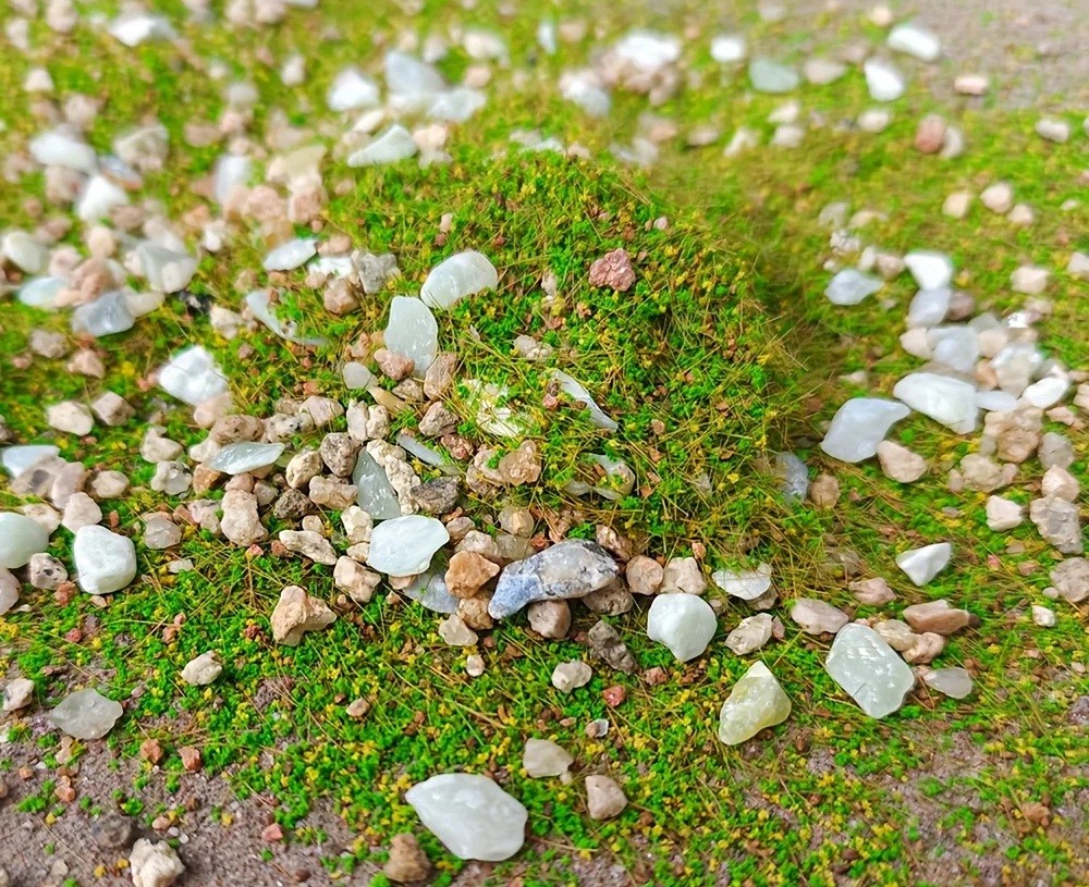 Dekorationsblandingen er populær ved skabelse af sandborde, model landskaber og tematiske dekorationer. Den grønne farve på planterne forbliver stabil og ser ikke kunstig ud. Stenene tilføjer kompositionen kontrast og et naturligt udseende. Hele sættet er designet til at muliggøre nem håndtering og gentagen brug. Det resulterende landskab ser harmonisk og realistisk ud.