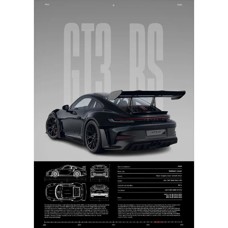 Dekorativ plakat med motiv af GT3-RS præsenterer et syn på sportsvogn set bagfra i kombination med tekniske illustrationer. Den nederste del af plakaten indeholder tegninger og skemaer, der supplerer hovedmotivet og skaber en interessant kontrast mellem realistisk fremstilling og grafiske elementer. Med dimensionerne 30 x 40 cm er det en universel dekoration, der passer til forskellige rum.