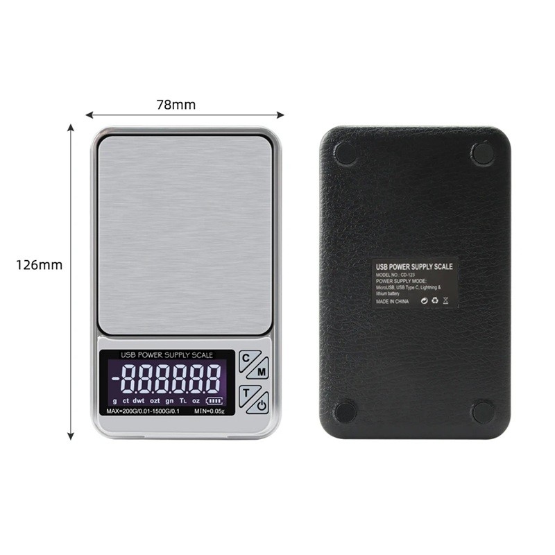En anden fordel er, at vægtdækslet kan bruges som udvidelig vægtskål, som er praktisk ved vejning af større genstande, krukker med krydderier eller mindre metallegeringer. Strømforsyningen sikres ved USB opladning, hvilket muliggør bekvem brug uden hyppig udskiftning af batterier (USB-kabel medfølger ikke).
