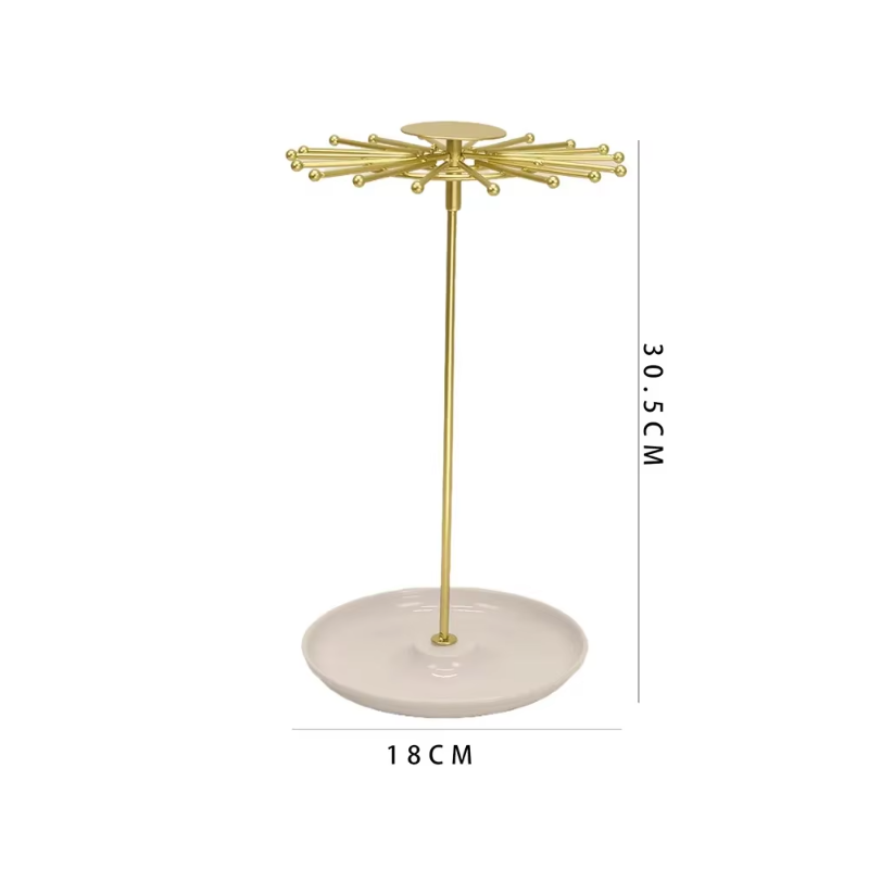 Metalstativet til smykker muliggør overskuelig opbevaring og udstilling af forskellige typer smykker. Takket være flere niveauer og kroge kan øreringe, halskæder, armbånd eller andre accessories hænges op.