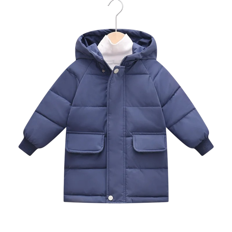 Drenge- og pige vinterjakke unisex med lynlås og knapper, hætte og lommer. Varm bomulds- og polyesterjakke til drenge og piger. Behagelig vinterbrug