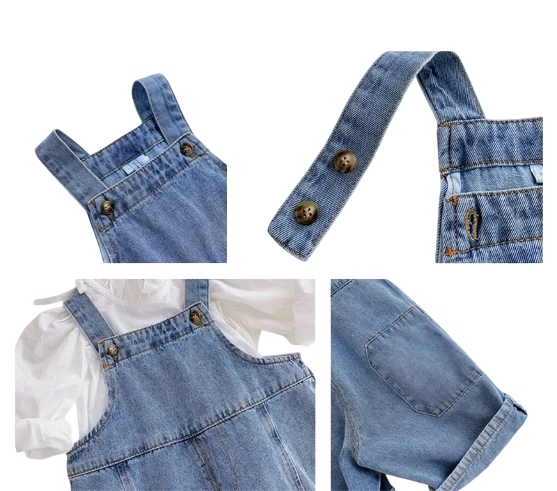 Drenge- og pigedragt i denim af bomuld og spandex Løs pasform Efterårs afslappet jumpsuit Blå ensfarvet jumpsuit med knapper