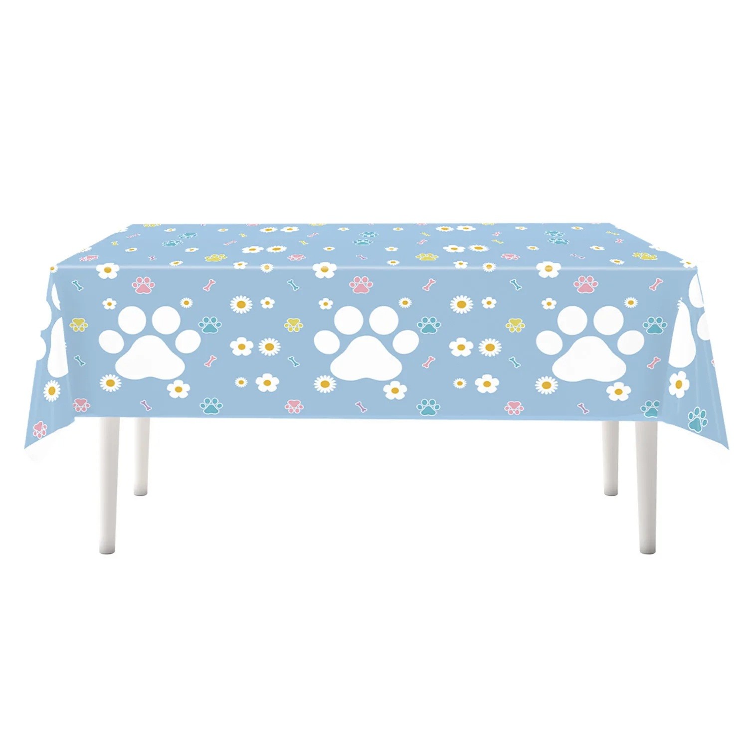 Dug til bord 137 × 274 cm Blå dug med motiv af hvide poter og blomster Dekorativ festdug til børnefødselsdag