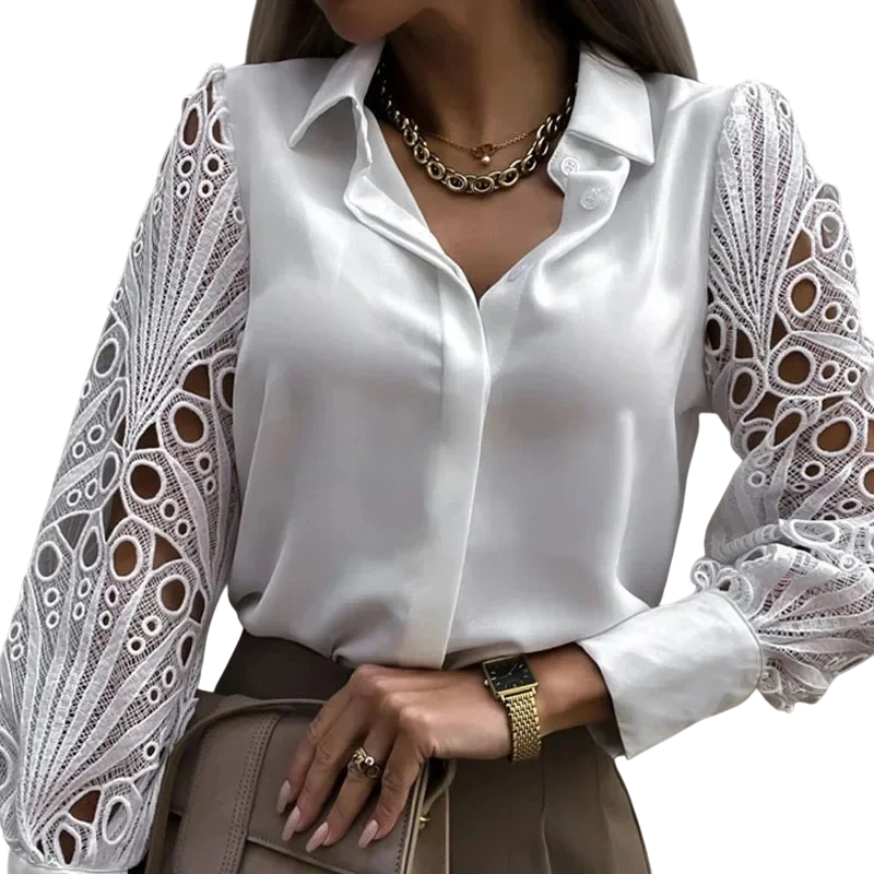 Elegant bluse til damer med lange ærmer Enfarvet skjorte i polyester med blondeærmer og krave Knaplukning Forskellige farver