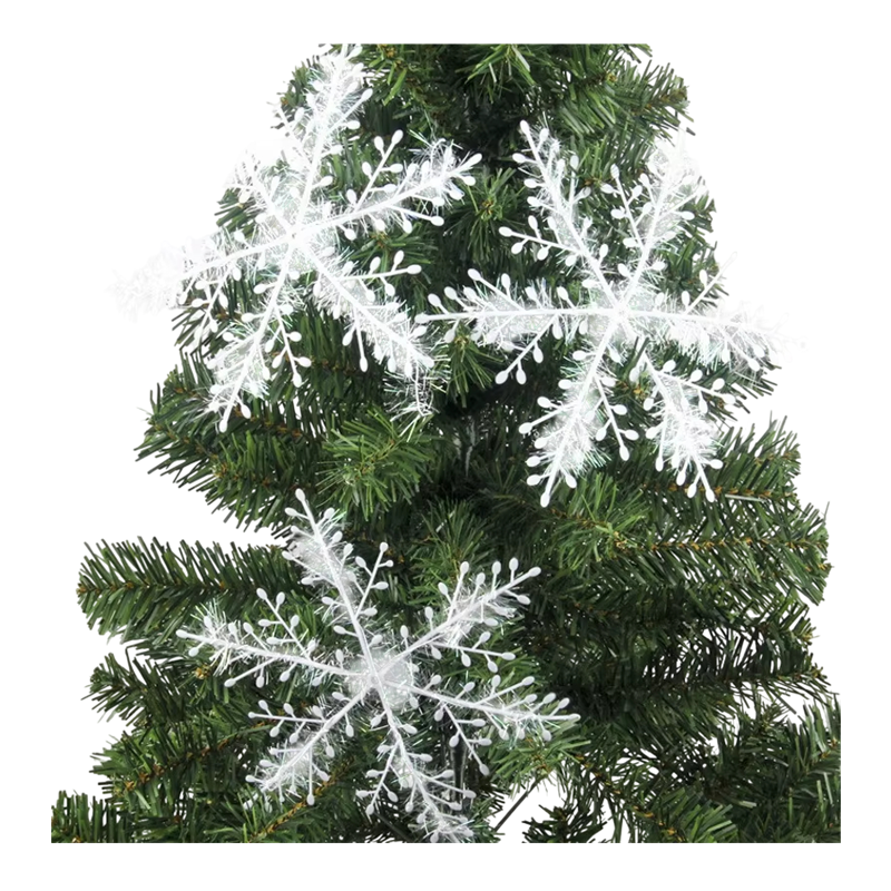 Denne sæt af store hængende snefnug er det ideelle valg for dem, der ønsker at skabe en markant og samtidig elegant vinterudsmykning. Med en størrelse på 15 cm fremstår hvert snefnug dominerende og skiller sig ud selv i større rum eller åbne områder. Den glitrende hvide overflade reflekterer lyset og giver dekorationerne et festligt præg, der minder om nyfaldet sne. Pynten er velegnet ikke kun til juletræet, men også som hængende dekorationer i vinduer, på lofter, guirlander eller tematiske installationer. Det universelle udseende muliggør deres anvendelse ved forskellige højtider og fejringer året rundt.