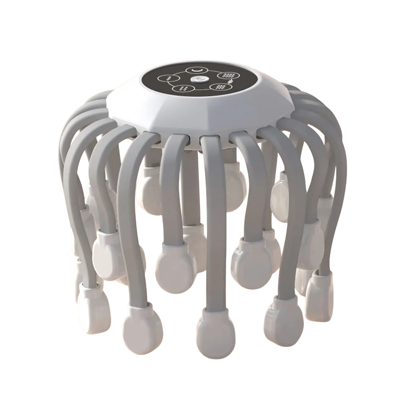 Elektrisk massageapparat med 20 massagehoveder, 3 intensiteter og vibrationsbehandling til hoveder med omkreds op til 60 cm. Ideel til stresslindring og forbedring af søvn. Fuld beskrivelse