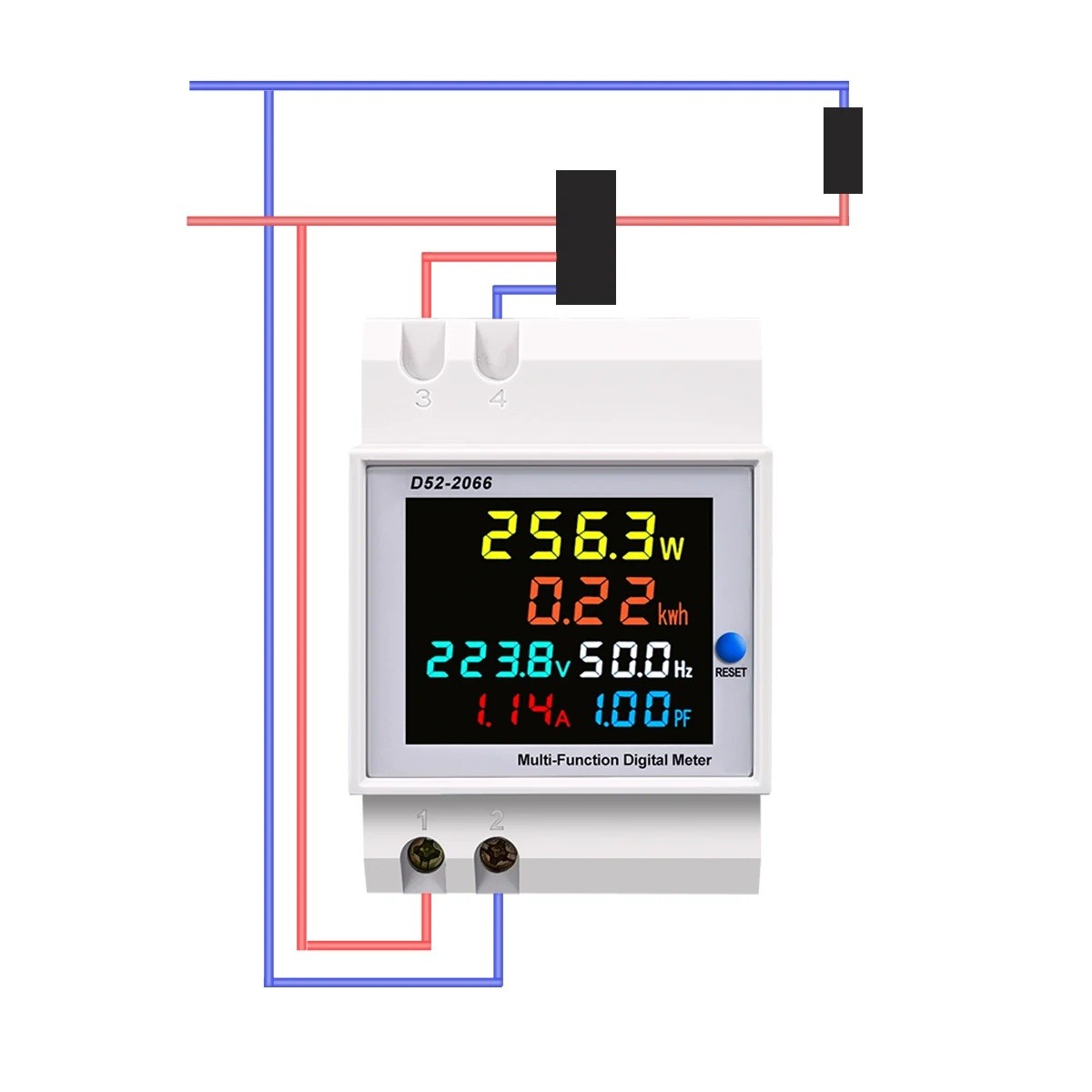 • Tilkobling: spænding 1–2, ekstern CT til 3–4, belastningsledning skal trækkes gennem CT sensoren.