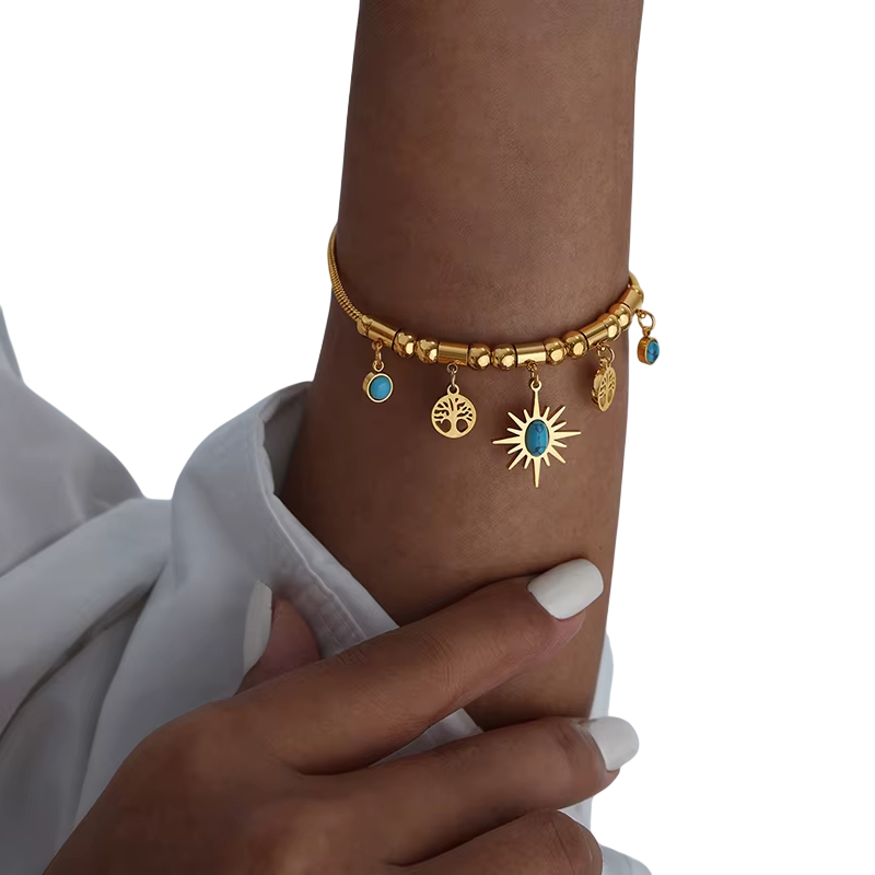 Dette elegante etno boho smykkesæt er designet til kvinder, der elsker original stil og markante mode accessories. Halskæden med en længde på 40+5 cm fremhæver smukt dekolletéen og giver outfittet et fint og sofistikeret udseende. Sættet inkluderer også et armbånd med en længde på 17+5 cm, som perfekt komplementerer halskæden og skaber en harmonisk helhed. Smykkerne er lavet af højkvalitets rustfrit stål, som er kendt for sin holdbarhed, lange levetid og elegante glans. Dette etno boho smykkesæt er det ideelle valg til bryllupsfejringer, sociale begivenheder og daglig stil.