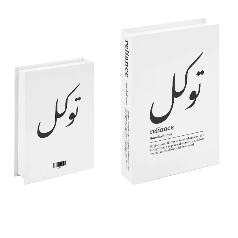 Denne moderne falske bog fanger med sit rene sort-hvide design og den markante arabiske tekst Tawakkul på forsiden. Det minimalistiske design virker elegant, tidløst og passer nemt ind i forskellige typer indretninger. Den nederste del af omslaget suppleres med det engelske udtryk „reliance“ inklusive en kort definition, som giver dekorationen en dybere betydning. Ryggen af bogen er forsynet med en vertikal tekst reliance, hvilket gør modellen realistisk passer ind blandt de andre bøger i biblioteket. Den største fordel er den åbne konstruktion med skjult opbevaringsplads.