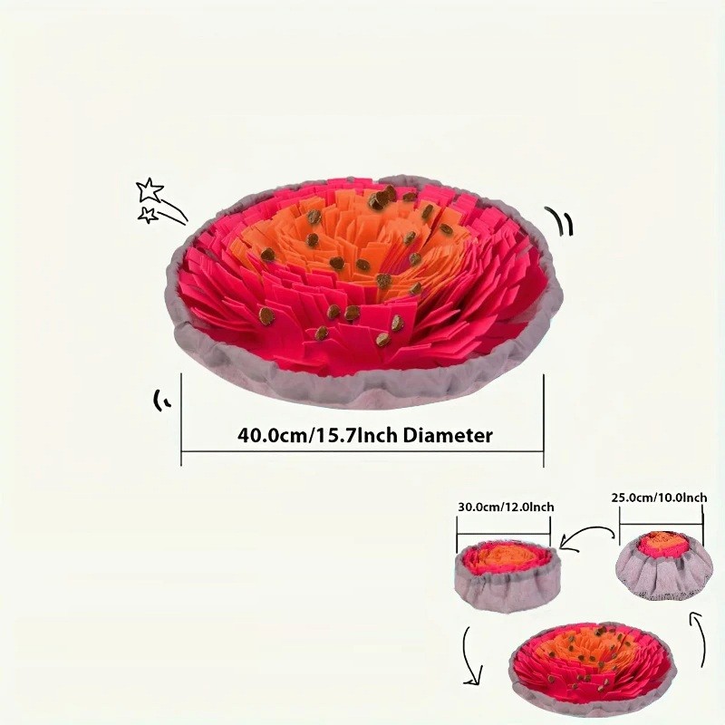Denne farverige snusemåtte er det ideelle redskab til træning af lugtesans, langsom fodring og underholdning af din hund. Takket være sin diameter på 40 cm giver den rigeligt med plads til at skjule godbidder, som din hund skal finde. Fremstillet af blødt, men holdbart filt sikrer den komfortabel brug og lang levetid. Måtten er sammenfoldelig, hvilket gør den nem at opbevare og transportere, og den er derfor også velegnet til rejser.
