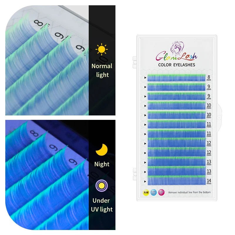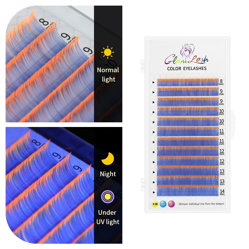 Farverige UV lysende individuelle kunstige vipper C krumning 8–14 mm tykkelse 0,07 mm Neon limbare vipper til volumforlængelse