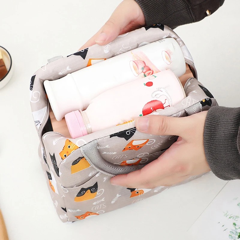 Forside Forside Sport og friluftsliv Camping og friluftsliv Rejsetilbehør Frokost termo taske med kattemotiv 23x13x19 cm Lys kaffe Isolerende køletaske til mad Snacktaske til skole arbejde
