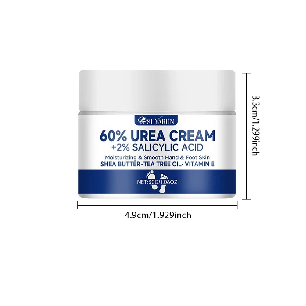 Fugtgivende creme til fødder og hænder 30 g 60 % urea 2 % salicylsyre Sheasmør Tea tree Vitamin E 4,9 x 3,3 cm