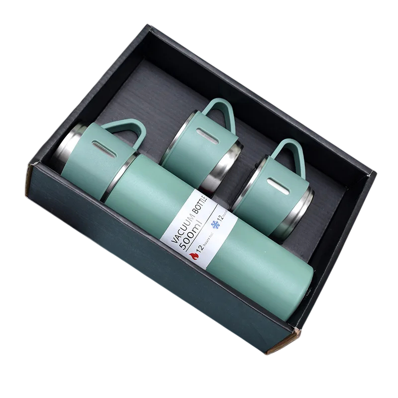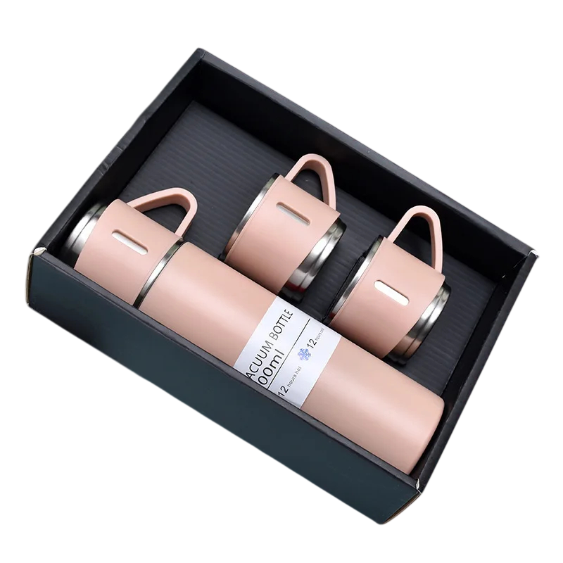 Gaveæske med termokande og krus 500 ml Rustfri termokande 23,9 × 6,6 cm med 3 krus 6,6 × 5,9 cm Varmeisolering 6–12 timer Rejsesæt