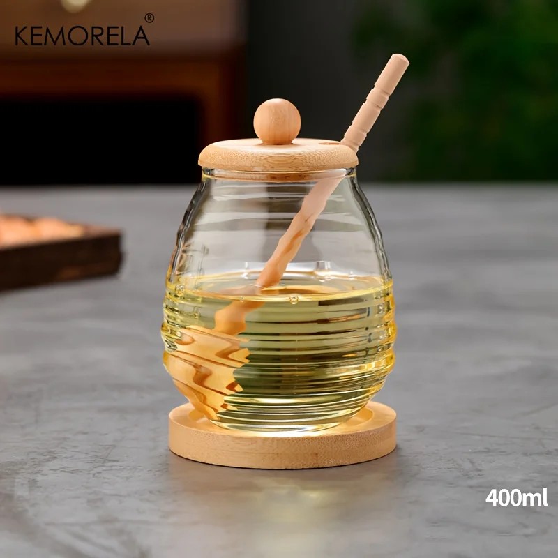 Forside Forside Hjem og husholdning Til køkkenet Køkkenudstyr Flaskelukkere og propper Glas til honning 400 ml med låg og honningske gennemsigtig beholder til honning med stativ til hjemmebrug i køkkenet