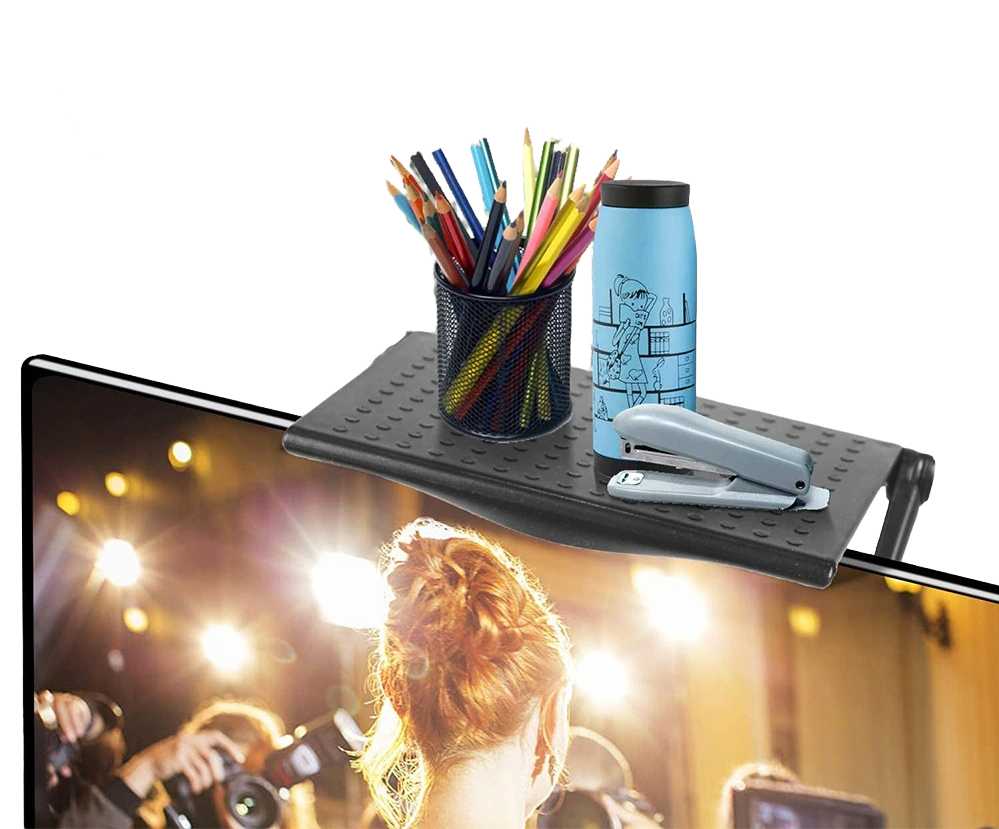 En praktisk hylde til at fastgøre på kanten af dit TV. Det vil skabe ny plads, hvor du kan placere andre enheder . Praktisk opbevaring af din Wifi-antenne, settopboks, fjernbetjening eller andre småting. Installation uden boring eller skruning .