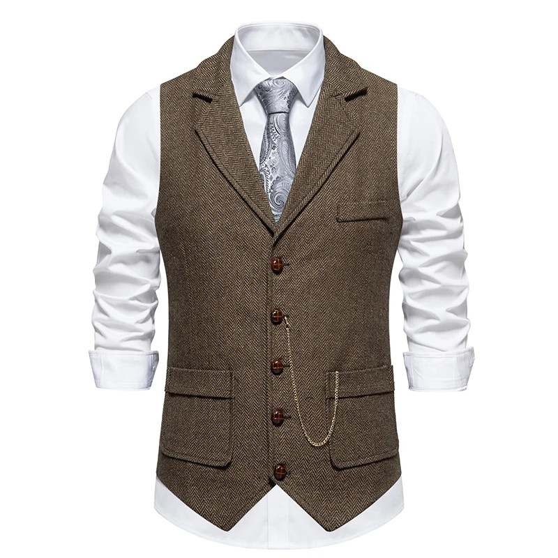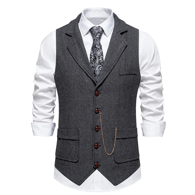 Herre elegant vest med kæde og lommer En ensfarvet vest med krave og knapper Formelt selskabs vest