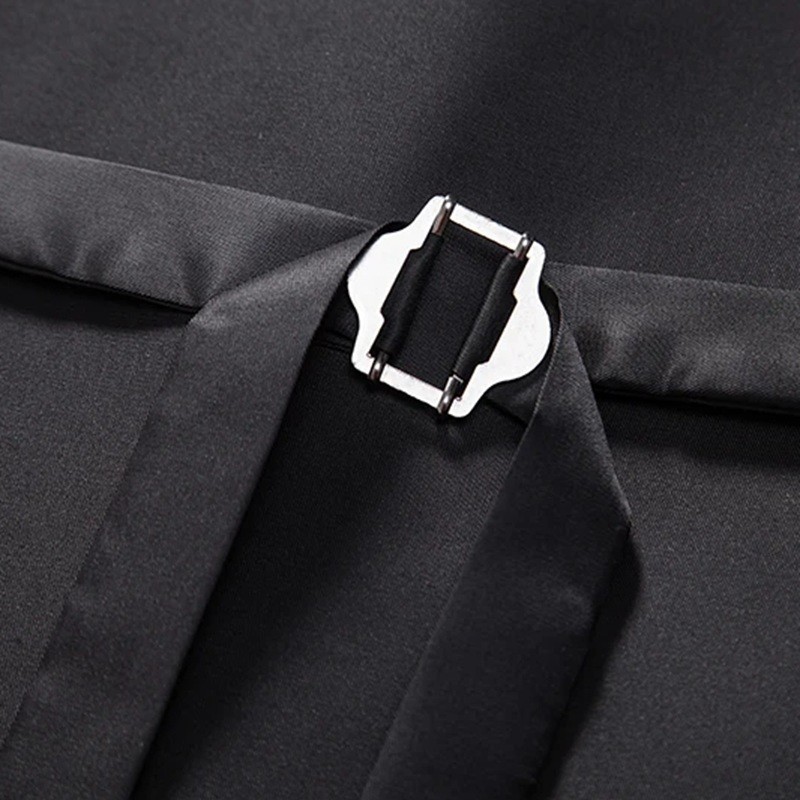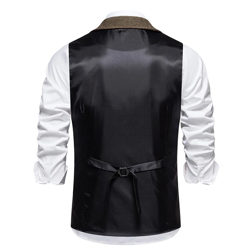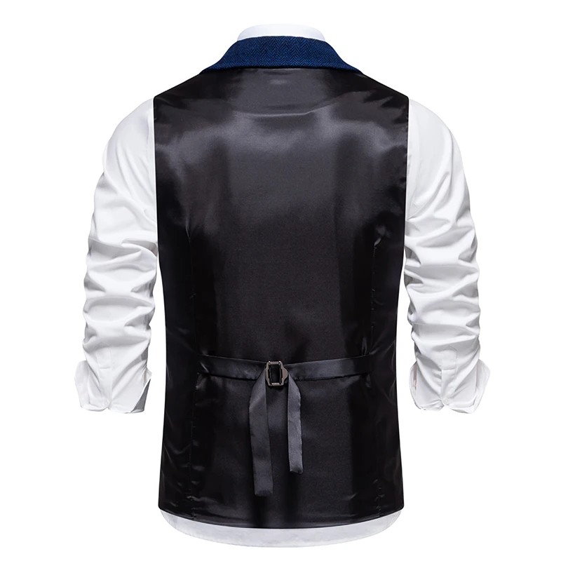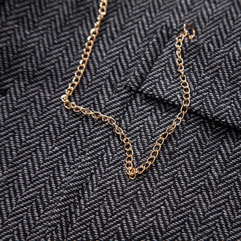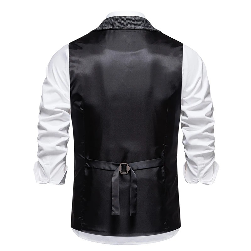 Denne herre elegante vest repræsenterer den perfekte kombination af stil, komfort og tidløst design. Den er det ideelle valg for mænd, der ønsker at fremstå velplejede og selvsikre ved formelle begivenheder, forretningsmøder eller festlige lejligheder. Vesten er lavet af polyester og spandex, hvilket sikrer dens elasticitet, behagelige overflade og lange levetid. Takket være det klassiske snit med krave, brystlomme og dekorativ kæde fremstår den både elegant og moderne.