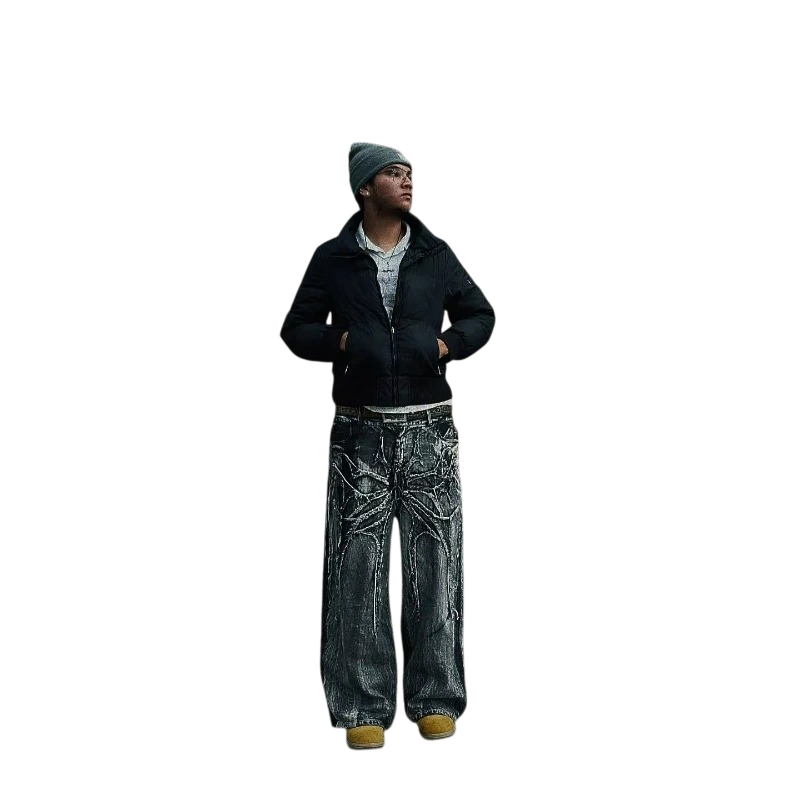 Herre jeans i sort med edderkoppeprint, løse, med lommer, lav talje, denim Herre jeans i sort med unikt edderkoppeprint på baglommen er ideelle for dem, der ønsker at skille sig ud. Takket være den lave talje og det løse snit er de meget komfortable og praktiske til daglig brug. Jeansene er fremstillet af kvalitetsdenim, som giver den nødvendige holdbarhed og komfort. Praktiske lommer er tilstrækkeligt rummelige til småting og andre nødvendigheder. Denne model er ideel for mænd, der søger både komfort og en markant stil.