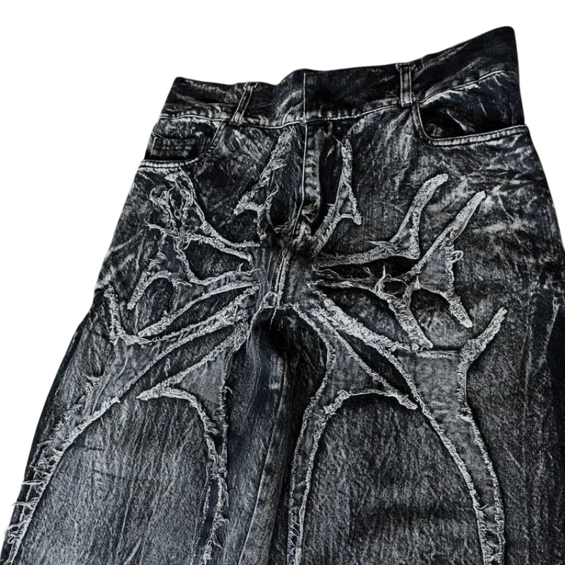 Herre jeans i sort med edderkoppeprint, løse, med lommer, lav talje, denim