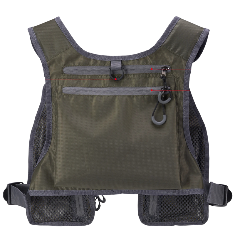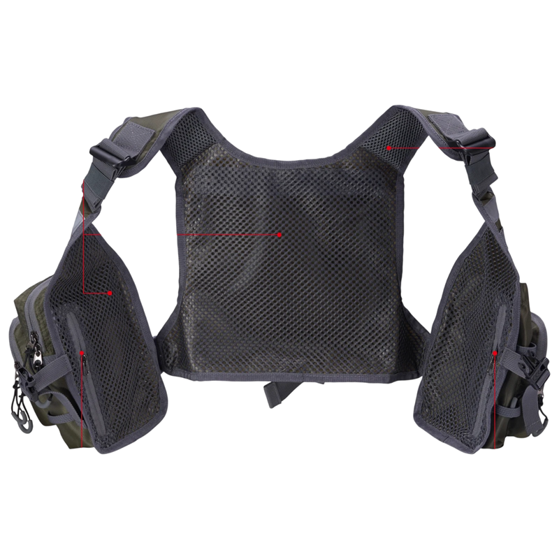 Bagsiden af vesten er lavet af åndbart netstof, som kan bidrage til bedre luftcirkulation under bevægelse. Justerbare stropper på skuldrene og i taljen hjælper med at tilpasse vesten til forskellige kropstyper.