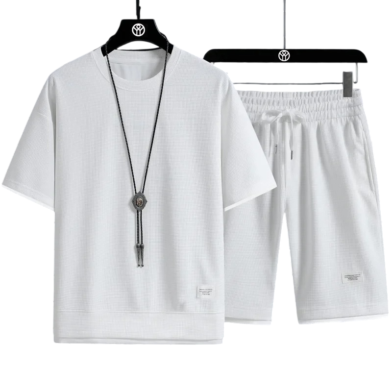 Herresæt med shorts, T-shirt med korte ærmer og O-hals, ensfarvet, polyester Dette herresæt er det ideelle valg til varme dage og fritid. Sættet indeholder shorts med snøre og en T-shirt med korte ærmer og O-hals, hvilket sikrer komfort og stil. Fremstillet af kvalitets polyester, er sættet let, åndbart og nemt at vedligeholde. Det ensfarvede design gør det nemt at kombinere med andre stykker og sikrer et moderne udseende. Dette outfit er perfekt til gåture, afslapning eller almindelig daglig brug.