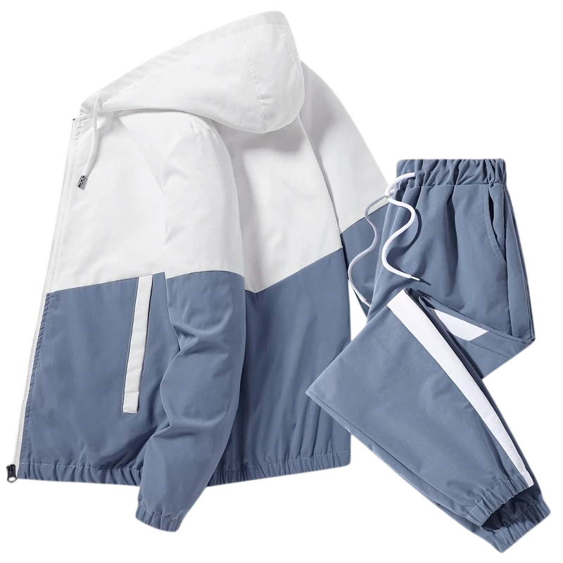 Herresæt med snoretræk, jakke med hætte og lynlås samt lommer, polyester