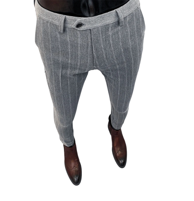 Disse bukser er det perfekte valg for mænd, der ønsker at se elegante ud og samtidig føle sig komfortable. Bomulden sikrer åndbarhed og blødhed, spandex giver elasticitet og polyester sikrer holdbarhed og formstabilitet. Det fine stribemønster giver bukserne en personlig kant og et diskret udseende, der er velegnet til både formelle og afslappede outfits. Takket være deres alsidige design passer de både til skjorter og til sweatre eller jakker. Disse stilfulde og alsidige herrebukser forener elegance, funktionalitet og komfort i ét stykke, der ikke bør mangle i nogen moderne garderobe.