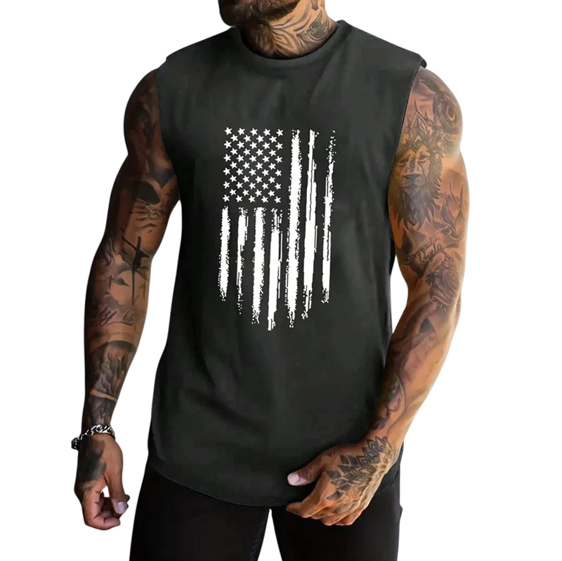 Stilfuld herretanktop i let polyester med motiv af det amerikanske flag tilbyder komfort, hurtig tørring og et markant udseende til sommeren. Fuld beskrivelse