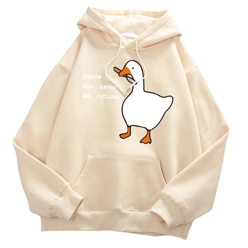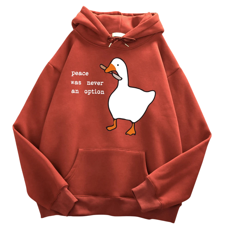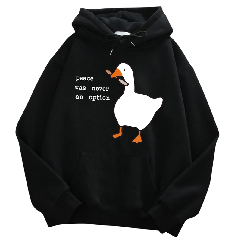 Denne herretrøje er det ideelle valg for mænd, der ønsker at kombinere komfort, kvalitet og originalitet. Fremstillet af holdbar polyester, der er behagelig at røre ved, let og nem at vedligeholde, tilbyder den perfekt komfort til hverdag. Det ensfarvede design suppleres af det markante tryk af and med kniv og teksten „Peace Was Never an Option“, hvilket gør den unik og fanger øjet ved første blik. Hætte med snore og forlommer sikrer funktionalitet og praktisk anvendelse, mens den komfortable pasform giver bevægelsesfrihed. Ideel til daglig brug, fritid eller som et markant modeaccessory.
