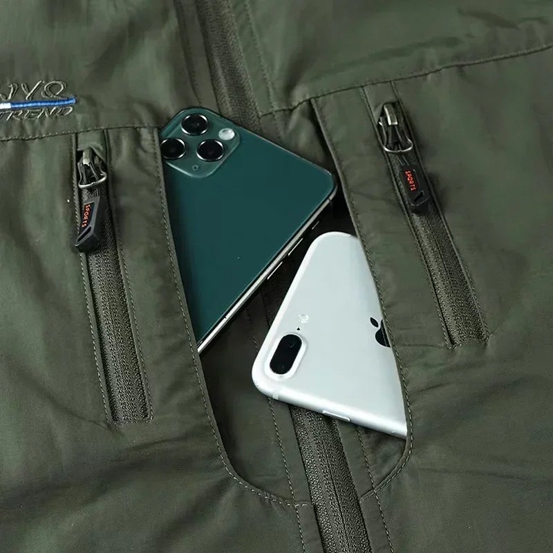 På forsiden af vesten er der lynlåslommer. Disse giver plads til opbevaring af småting, såsom nøgler, telefon eller andre personlige ejendele. Takket være lynlåsene kan de opbevarede ting beskyttes mere sikkert under bevægelse.