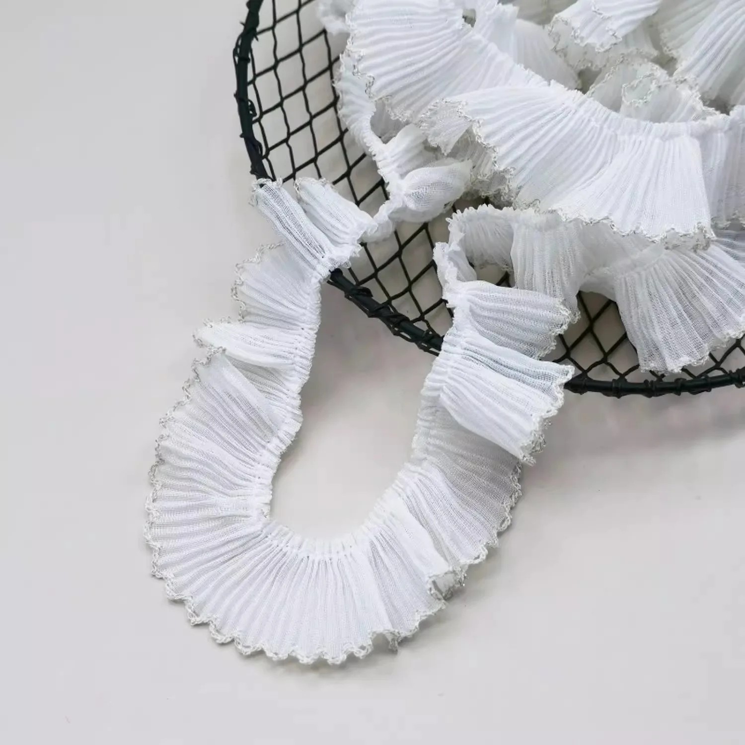 Elegant hvidt blondebånd i chiffon med dekorativ kant er et stilfuldt supplement til kreativ syning, pyntning af tøj og dekorationer. Takket være det fine chiffonmateriale virker båndet let, luftigt og meget elegant. Den hvide farve giver desuden båndet et universelt præg, hvilket gør det velegnet til bryllupsdekorationer, festpynt og daglige kreative projekter.