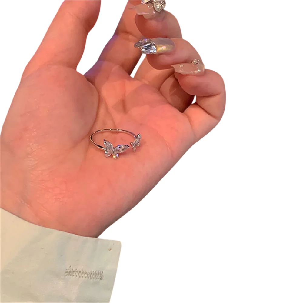 Delikat justerbar ring med sommerfugle dekoreret med glitrende sten tilføjer elegance til ethvert outfit. Behagelig at have på og universel størrelse. Fuld beskrivelse