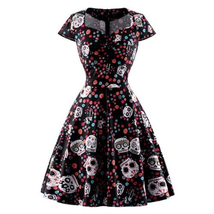 Damesommerkjole med svaj nederdel og korte ærmer.