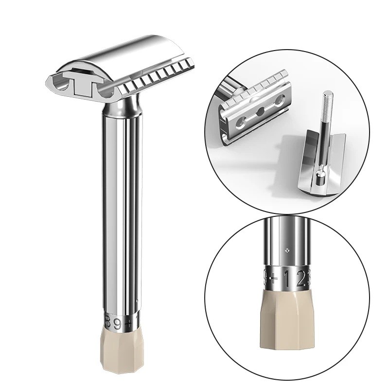 Overfladebehandlingen i sølvfarve skaber et enkelt og neutralt udseende, der er velegnet til daglig brug. Takket være det manuelle design er det en klassisk ikke-elektrisk barbermaskine, der ikke kræver batterier eller opladning.