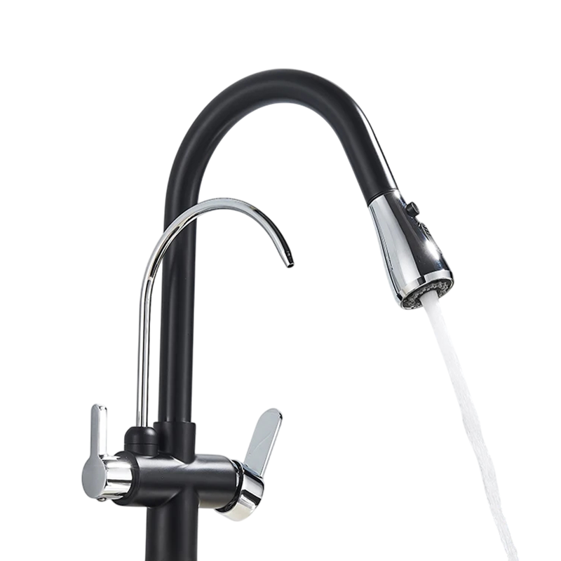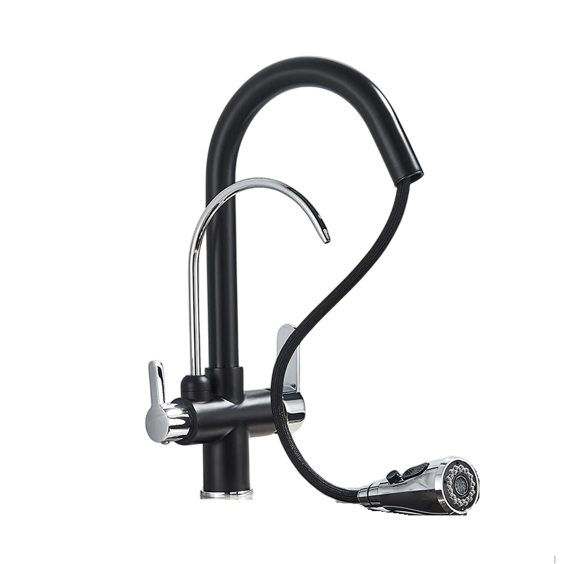 Køkkenbatteri med 360° roterende udløb og udtrækbar tud. To-farvet design med 3 måder at blande varmt og koldt vand. Filtreringssystem for rent vand. Fuld beskrivelse