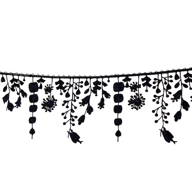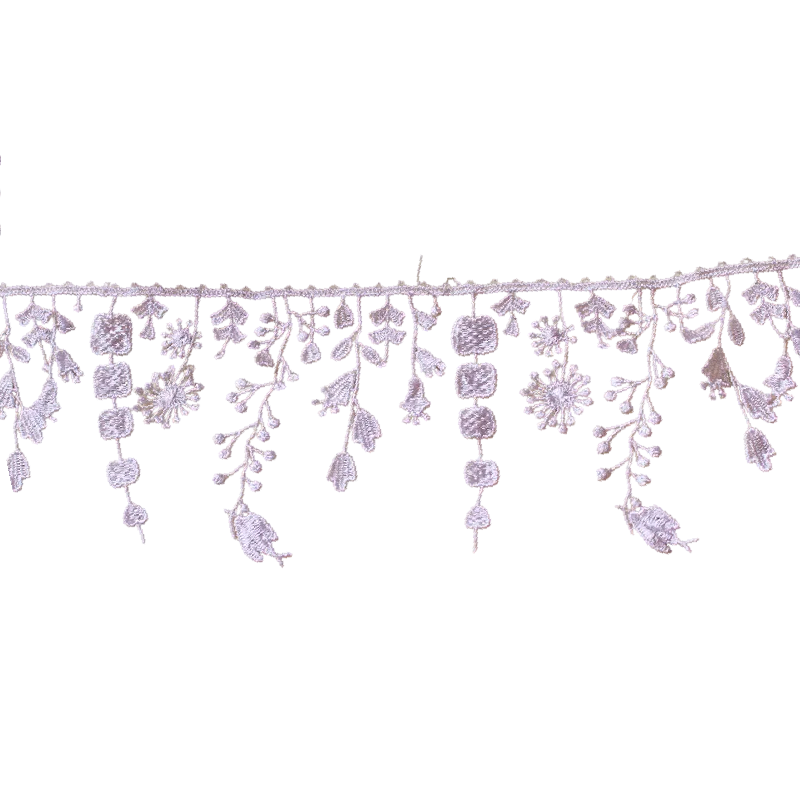 Dekorativt lacebånd med blomsterkvaster er et stilfuldt tekstiltilbehør velegnet til pyntning af tøj, modeaccessories og dekorationer. Det elegante lace-design suppleret med fine kvaster skaber en markant dekorativ effekt, der giver produkterne et romantisk og unikt udseende. Dimensioner 10 cm x 91 cm giver rigeligt materiale til forskellige kreative projekter og dekorative tekstilforbedringer.