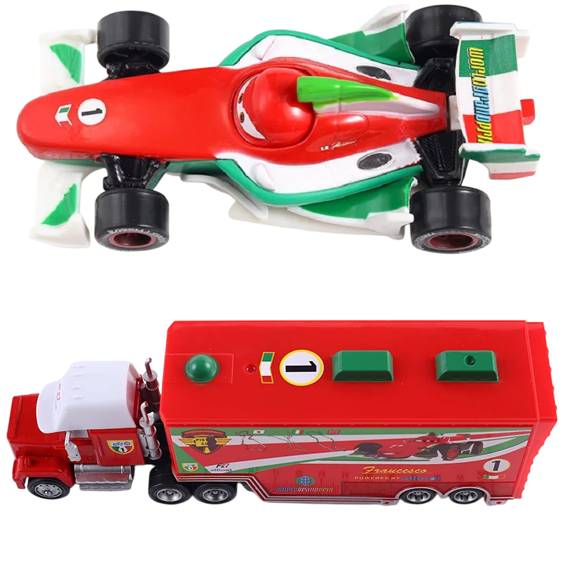 Yndlingsfigurerne fra Disney Pixars Biler vækkes til live i dette detaljerede todelte sæt. Modellerne, der indeholder en Mack Hauler-lastbil og en Francesco Bernoulli-racerbil, er inspireret af filmens udseende og er lavet af en kombination af plastik- og metallegering for holdbarhed og visuel appel. Bilerne har et realistisk design og er designet til at ligge komfortabelt i et barns hånd. Børn kan udspille velkendte scener eller skabe deres egne eventyr på racerbanen.
