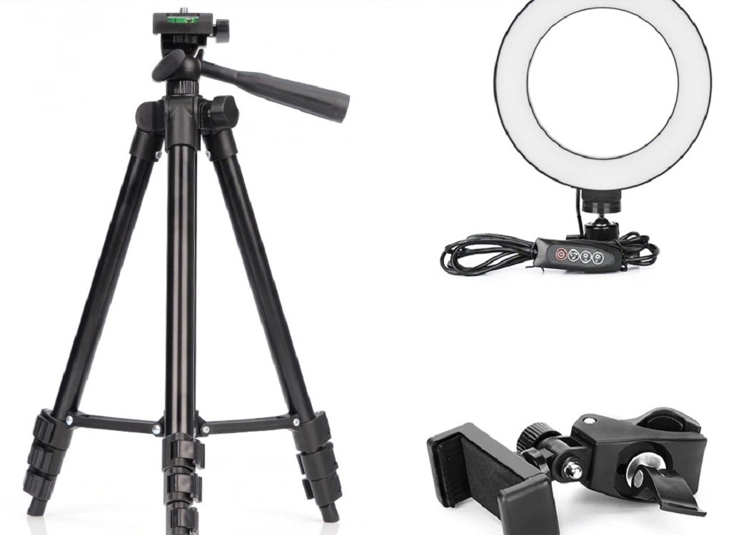 Pakkens indhold: 1x lys, 1x stativ, 1x telefonholder