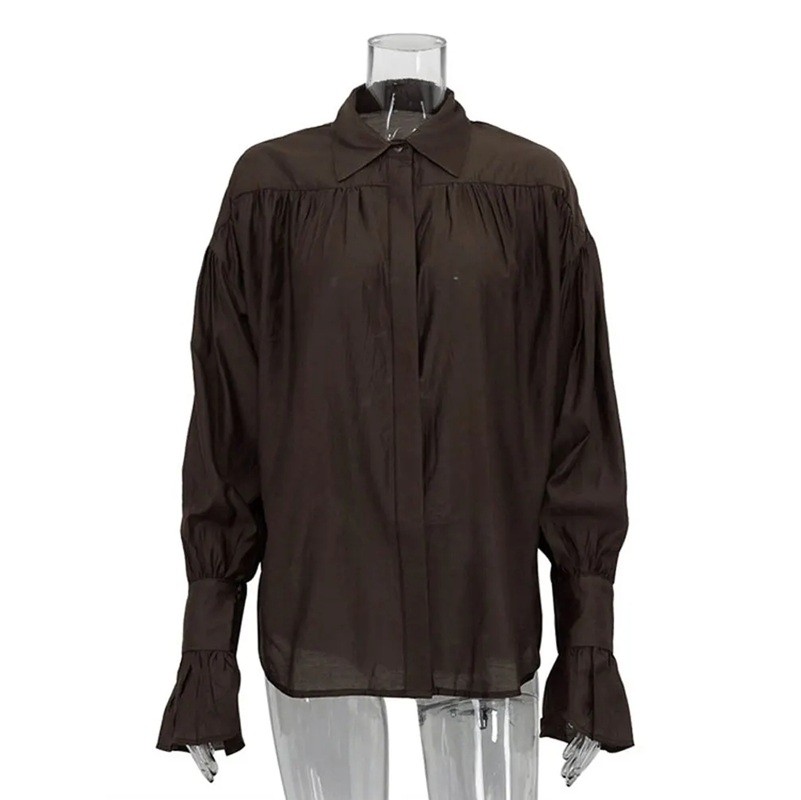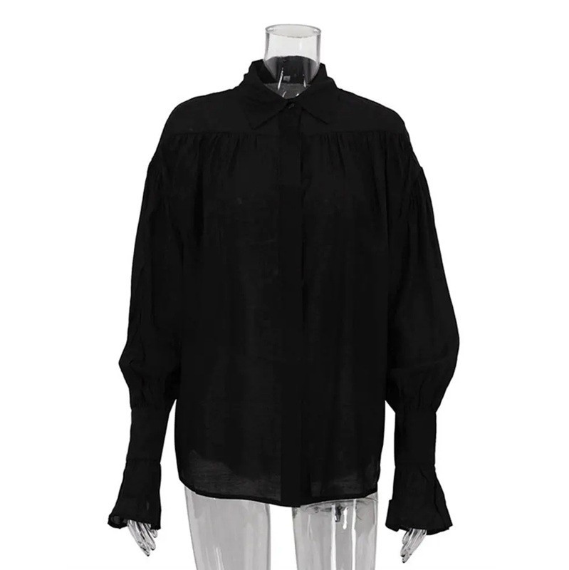 Forside Forside Tøj og tilbehør Dametøj Bluser til kvinder Bluser med lange ærmer til kvinder Løs, gennemsigtig damebluse med krave Langærmet Flæseærmer Let, luftigt materiale Elegant stil til sommer og fritid