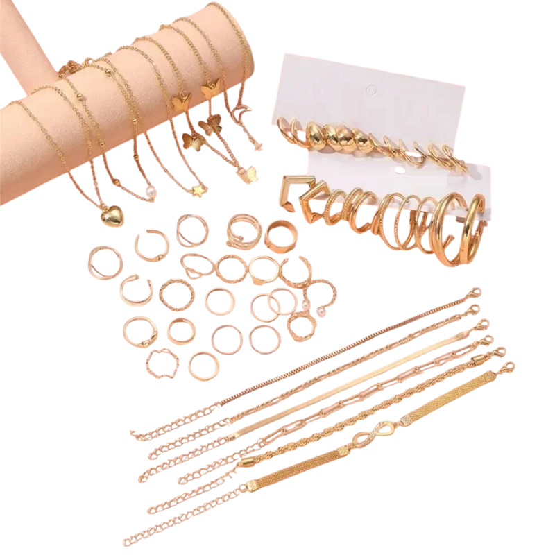 • Indhold af pakken: 57 stk smykker (halskæder, øreringe, armbånd, ringe)