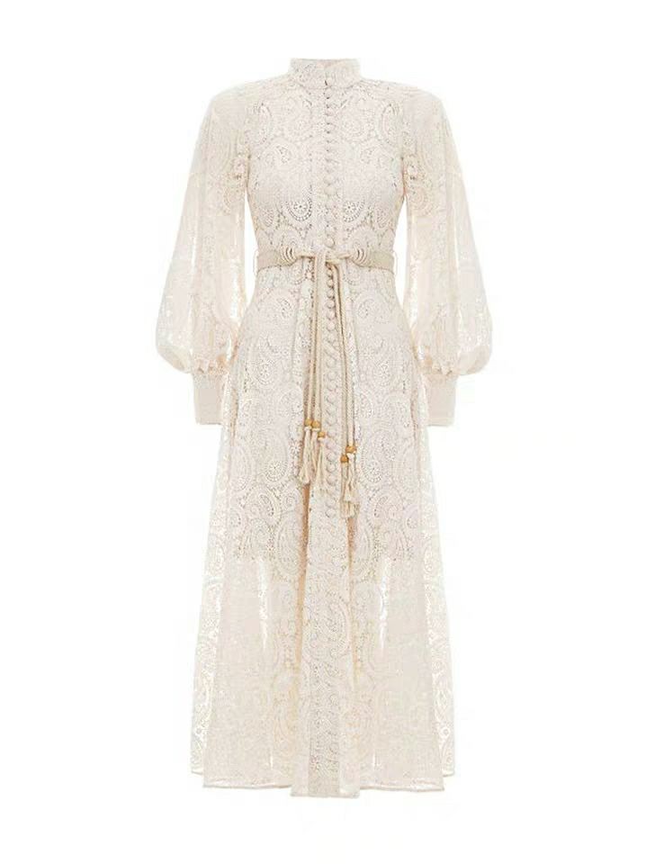 Midikjole i blonde med lange ærmer.