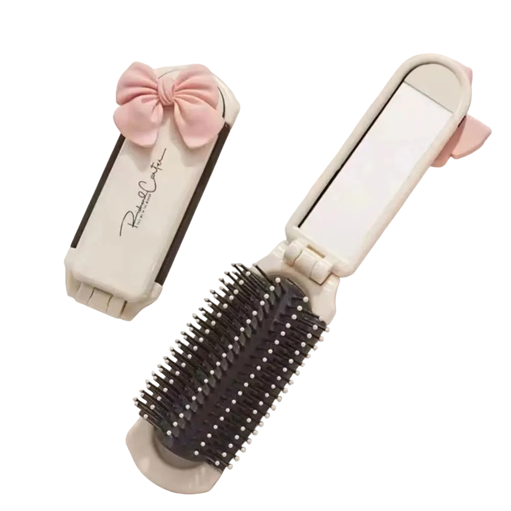 Sammenfoldelig rejsekam med udtrækkeligt spejl og dekorativ rosa sløjfe. Praktisk og stilfuldt accessory til tasken til hverdag. Fuld beskrivelse